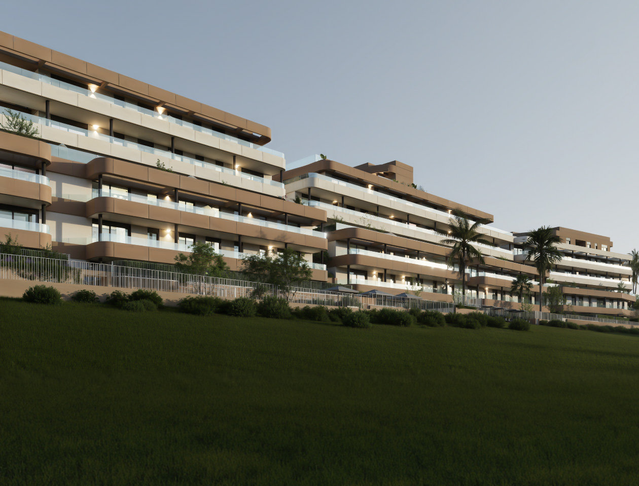 Las zonas verdes acompañan la arquitectura y el entorno natural de la promoción, creando recorridos y espacios exteriores donde la vegetación, la tranquilidad y la belleza del paisaje forman parte de la experiencia diaria.